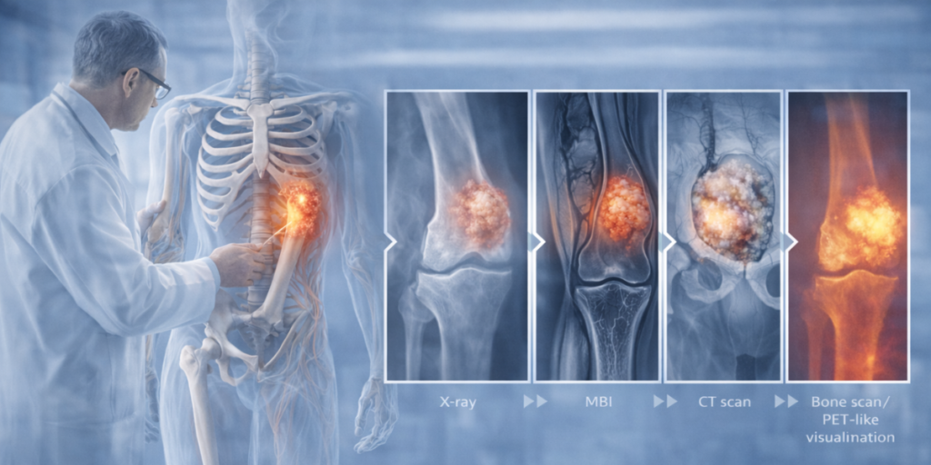 The diagnosis of bone cancer involves a detailed clinical evaluation followed by imaging and laboratory tests. X-rays are usually the first step to identify abnormal bone changes. Advanced imaging such as MRI and CT scans helps determine the size, location, and spread of the tumor. Bone scans or PET scans may be used to assess metastasis.